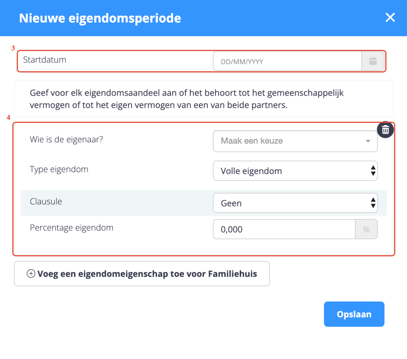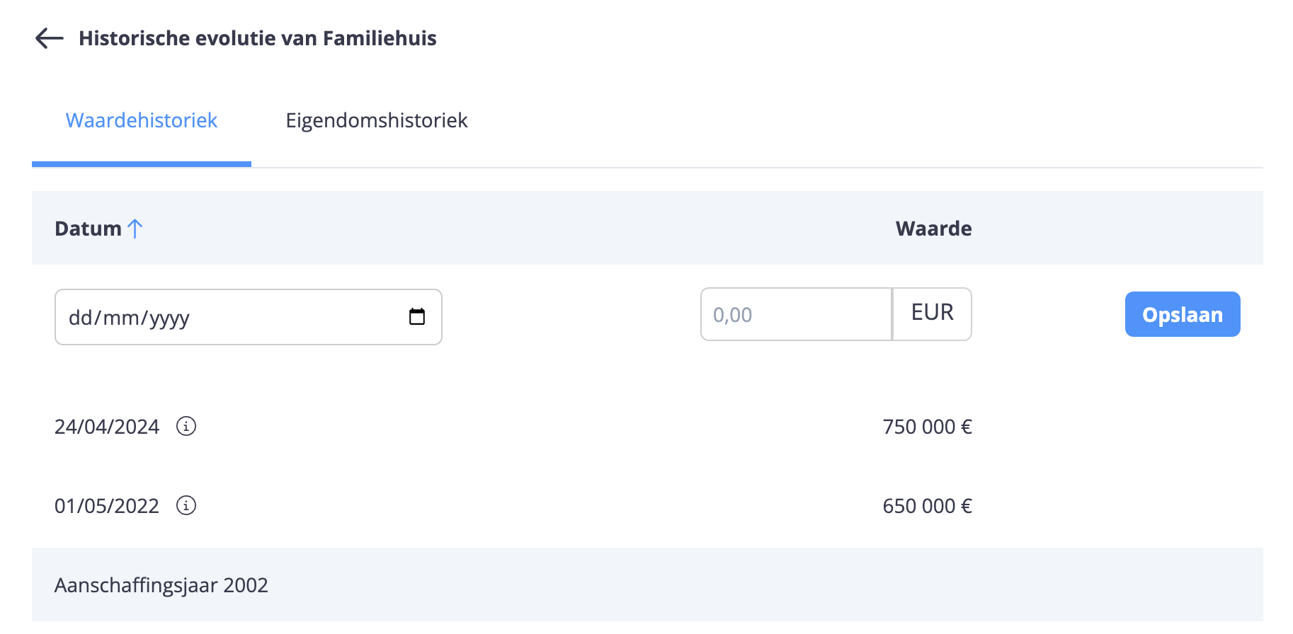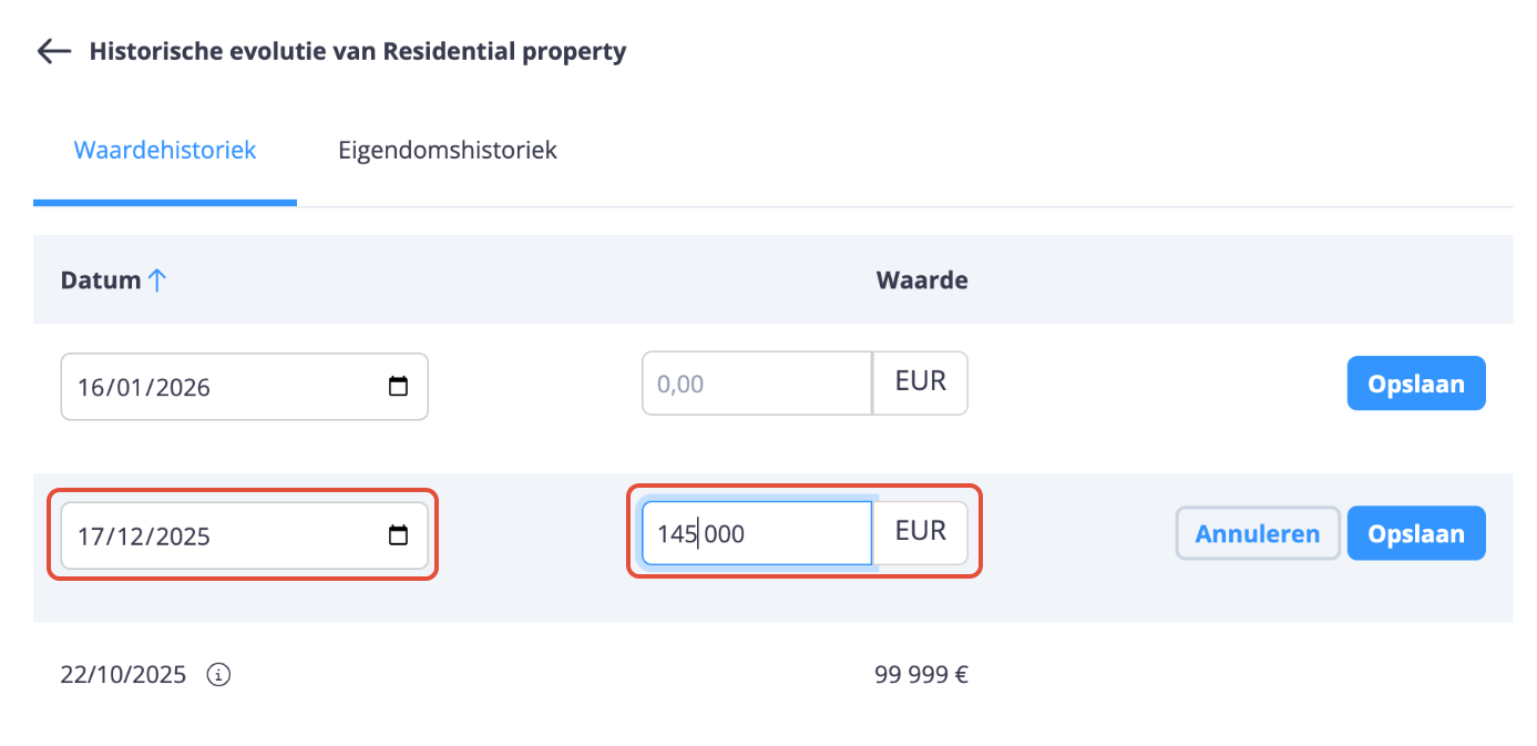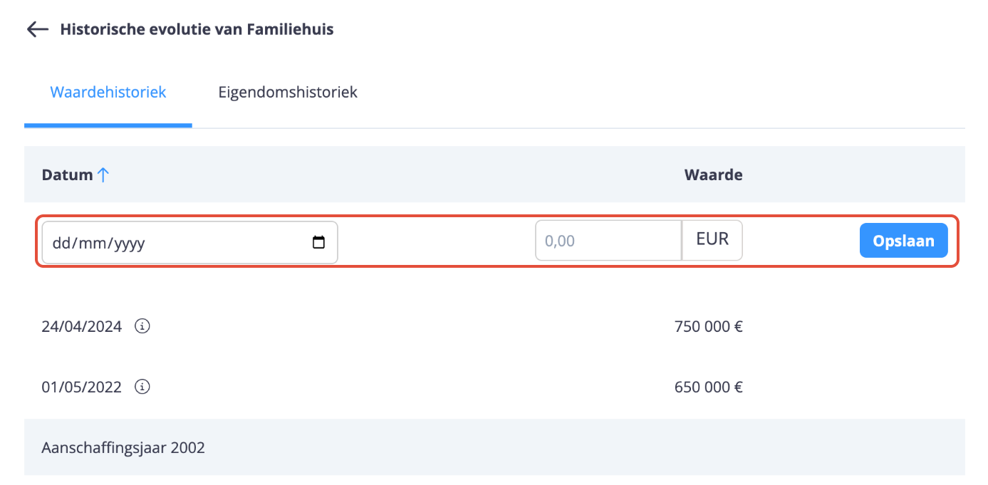 U kunt historische eigendomswijzigingen toevoegen of de huidige eigendom van een actief aanpassen (bijvoorbeeld in het kader van een schenking) door een nieuw datapunt aan te maken.