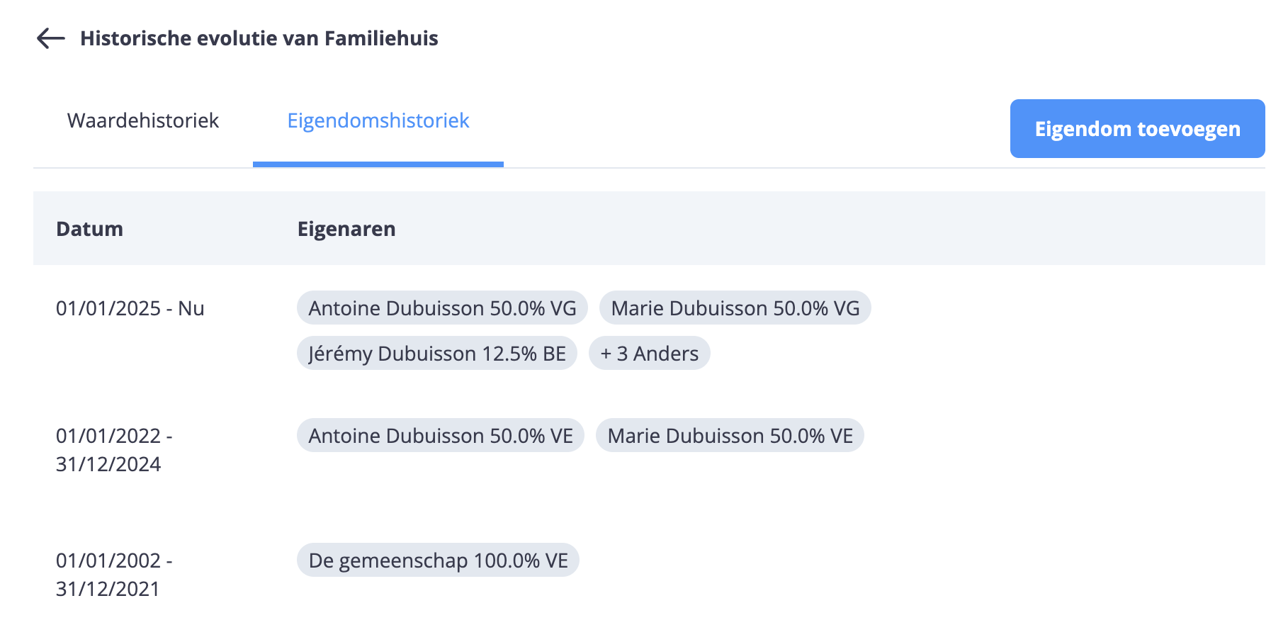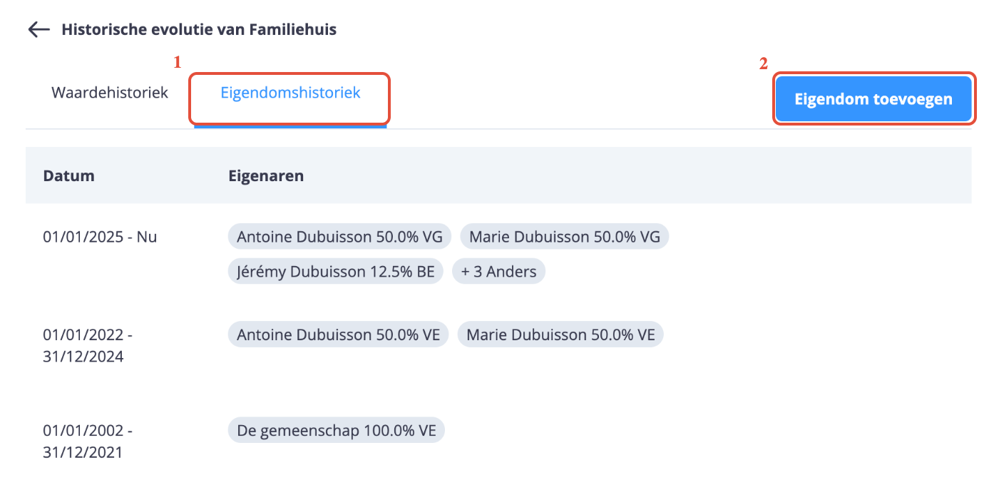 (2) Klik op de knop “Eigendom toevoegen” om een nieuwe historiek of eigendomswijziging toe te voegen.