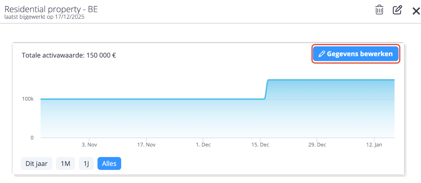 Als u de eigendomsgrafiek wijzigt in de detailfiche van het actief, wordt er een datapunt toegevoegd aan de historiek.