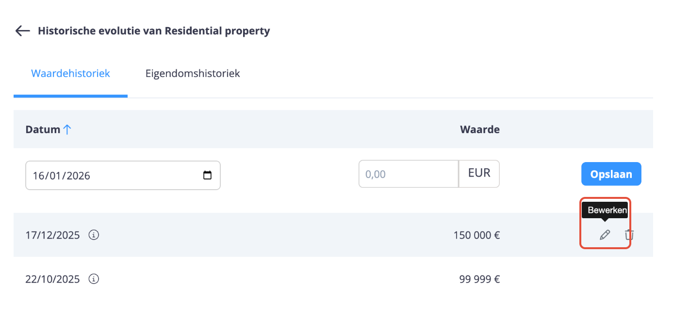 Om een nieuwe historische eigendomswijziging toe te voegen of de huidige eigendom te wijzigen: