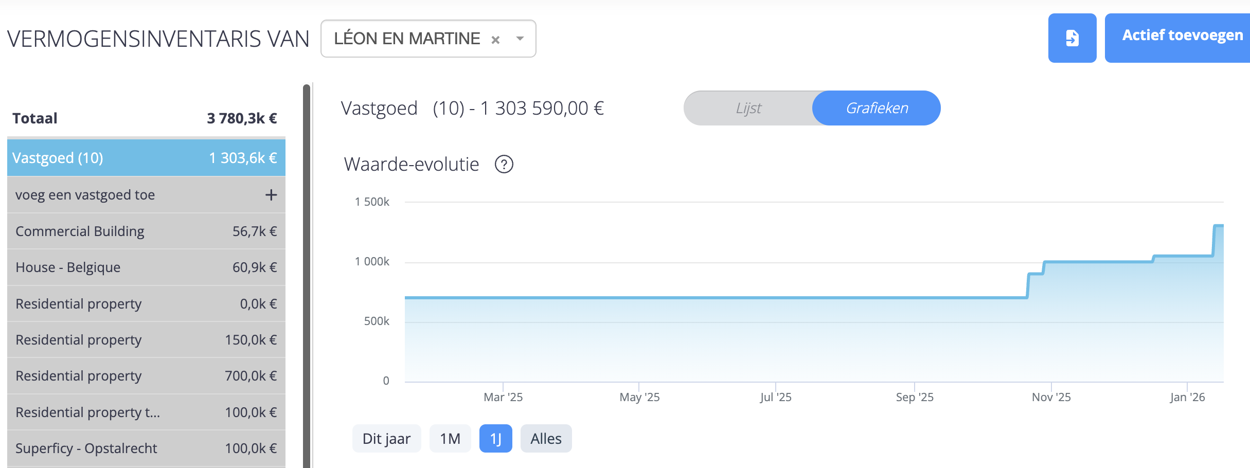 De grafiek van de waarde-evolutie laat toe om de historisering van de totale waarde van het actief te visualiseren over vier verschillende periodes, op basis van de waarde- en eigendomshistoriek: