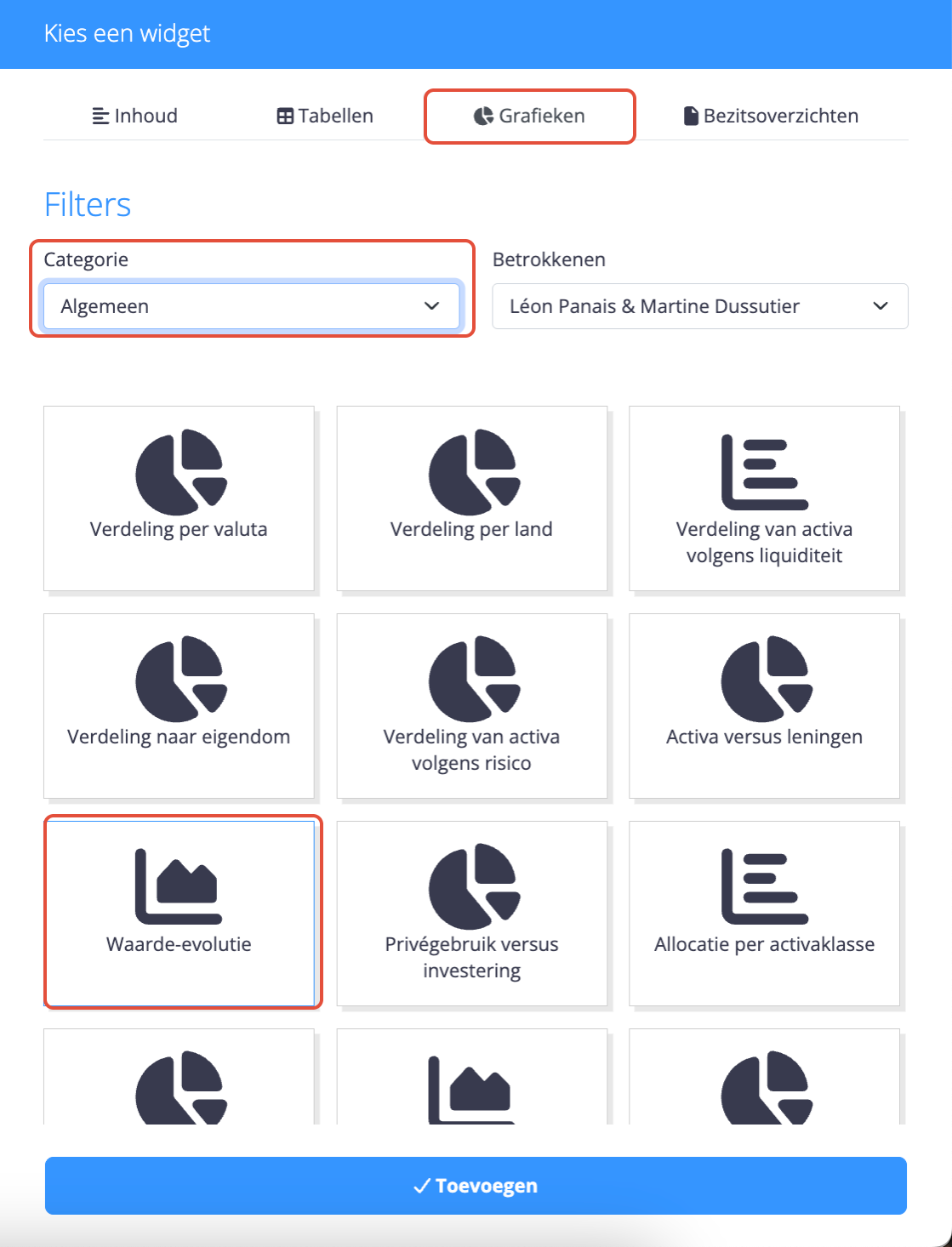 Deze grafiek is beschikbaar via de widgets “Grafieken”, in de categorie “Algemeen – Waarde-evolutie”.