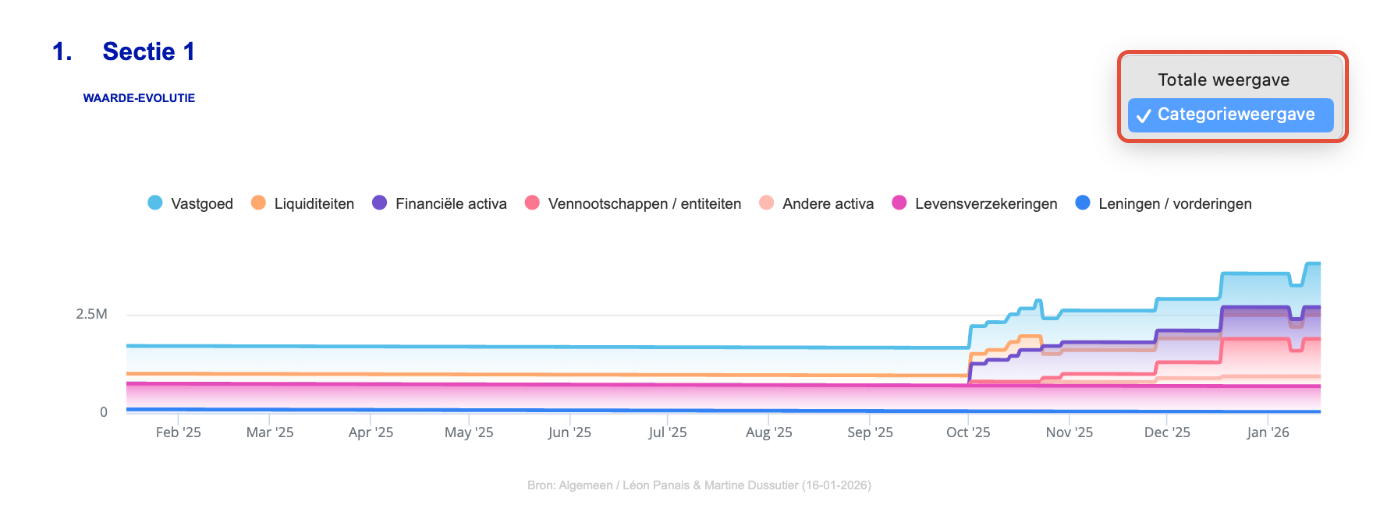 Voor elke activacategorie in de vermogensinventaris is er een historiek beschikbaar die de geaggregeerde waarde-evolutie van alle activa binnen die categorie weergeeft.