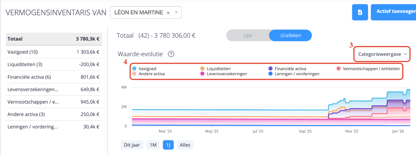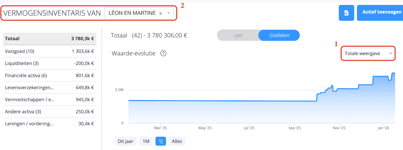(2) De grafiek evolueert in functie van de geselecteerde natuurlijke of rechtspersoon in “Vermogensinventaris van …”.