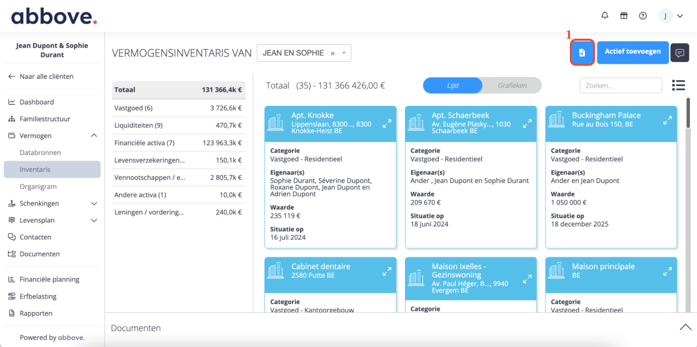 (1) In het vermogensoverzicht vindt u een “import”-icoon naast de knop “Een goed toevoegen”, aangezien deze functionaliteit uw klanten helpt om eenvoudiger nieuwe activa in het platform aan te maken.