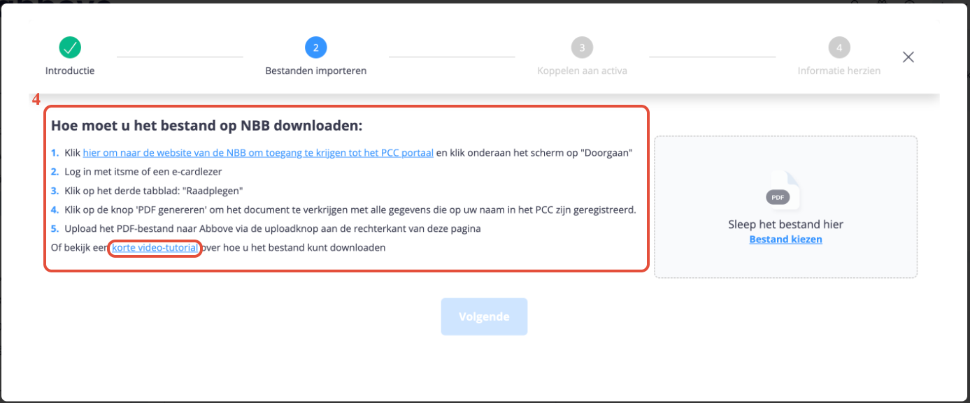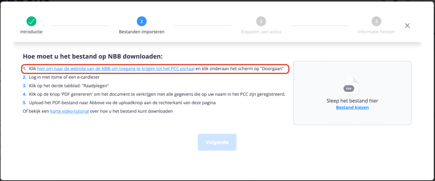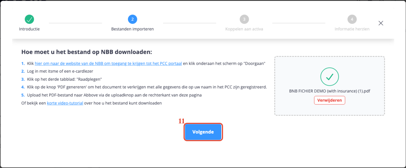 Het importproces opent met de eerste stap “Introductie”. Hier vindt u meer informatie over de Nationale Bank van België.
