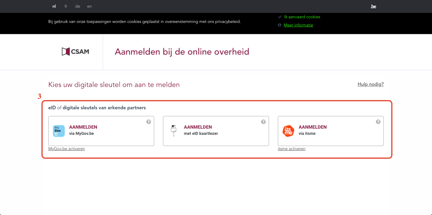 (3) Log in via MyGov.be, itsme of met uw elektronische identiteitskaartlezer.