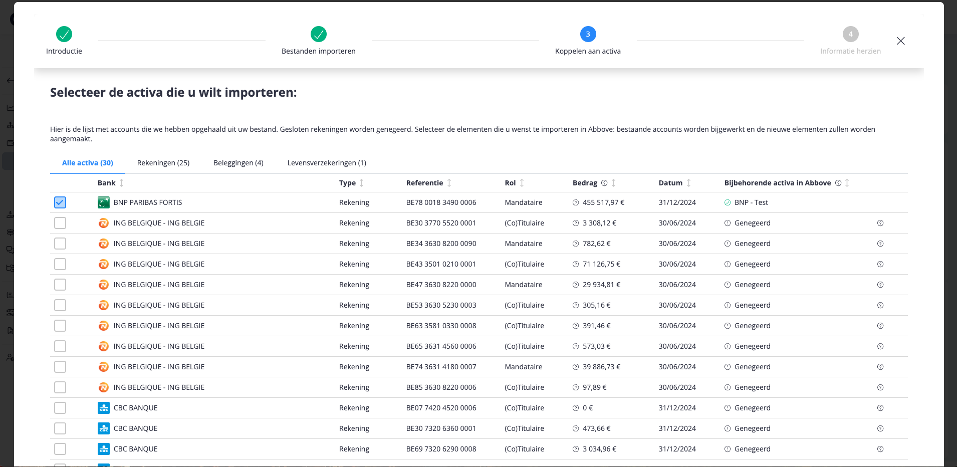 Selecteer de activa die u wenst te importeren door de weergegeven items aan of uit te vinken.